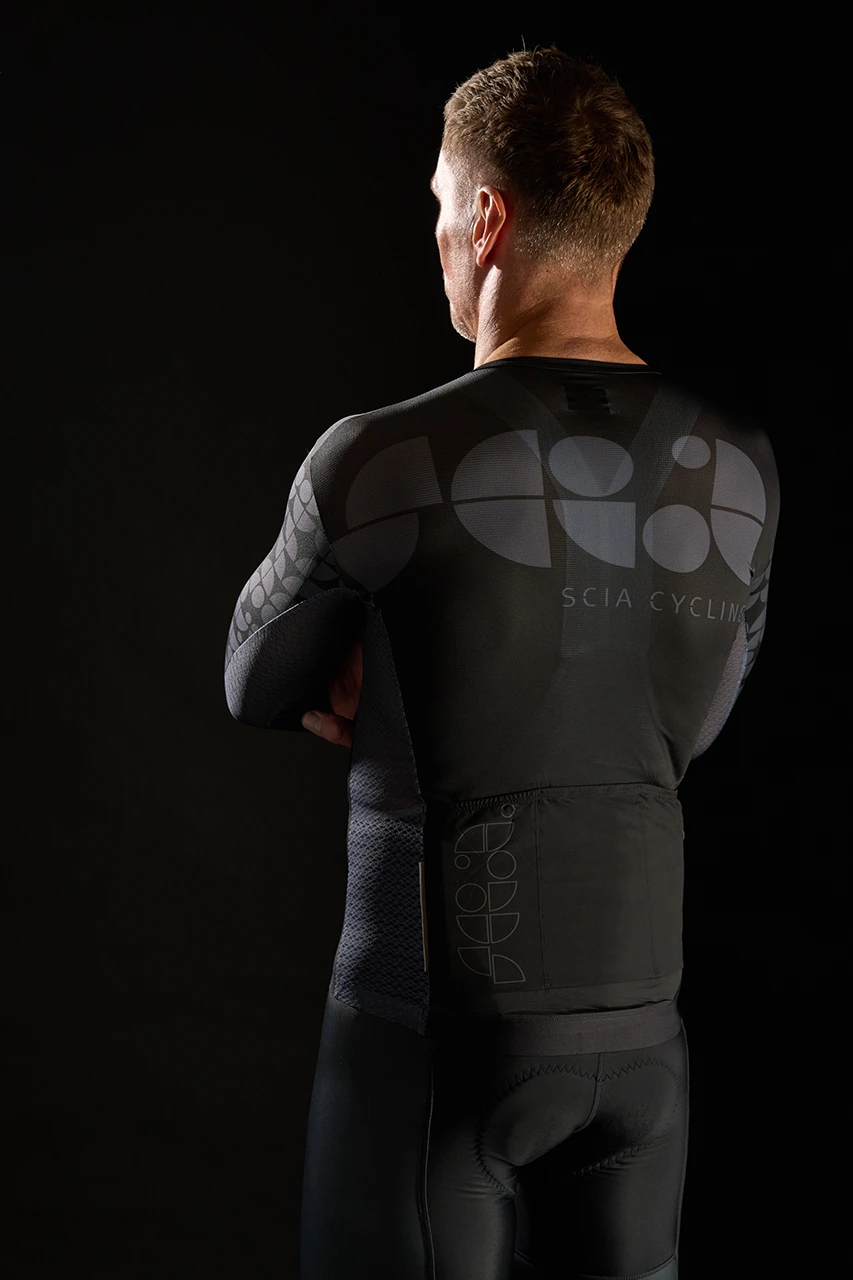 Designed for early starts and cooler riding conditions, this long sleeve cycling jersey delivers the same race-ready performance as our short sleeve jersey in a slightly warmer package. The streamlined competition cut provides a close, aerodynamic fit, while breathable panels and moisture-wicking fabrics regulate temperature and keep you dry as the effort builds. Slimline sleeves offer added coverage without bulk, and a smooth YKK full-length zip lets you fine-tune ventilation as the day warms up – perfect for crisp mornings, shoulder-season rides, and hard efforts in cool air.